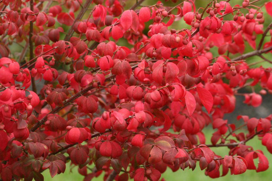 Svojimi jasne červenými listami krídlatý krík (Euonymus alatus) vytvára jasný záver záhradného roka.